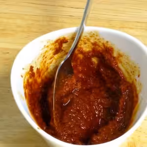 Making spicy harissa paste from powder is quick and easy. Plus you can make it to a consistency that suits you. This recipe as written is for a thick but workable paste.